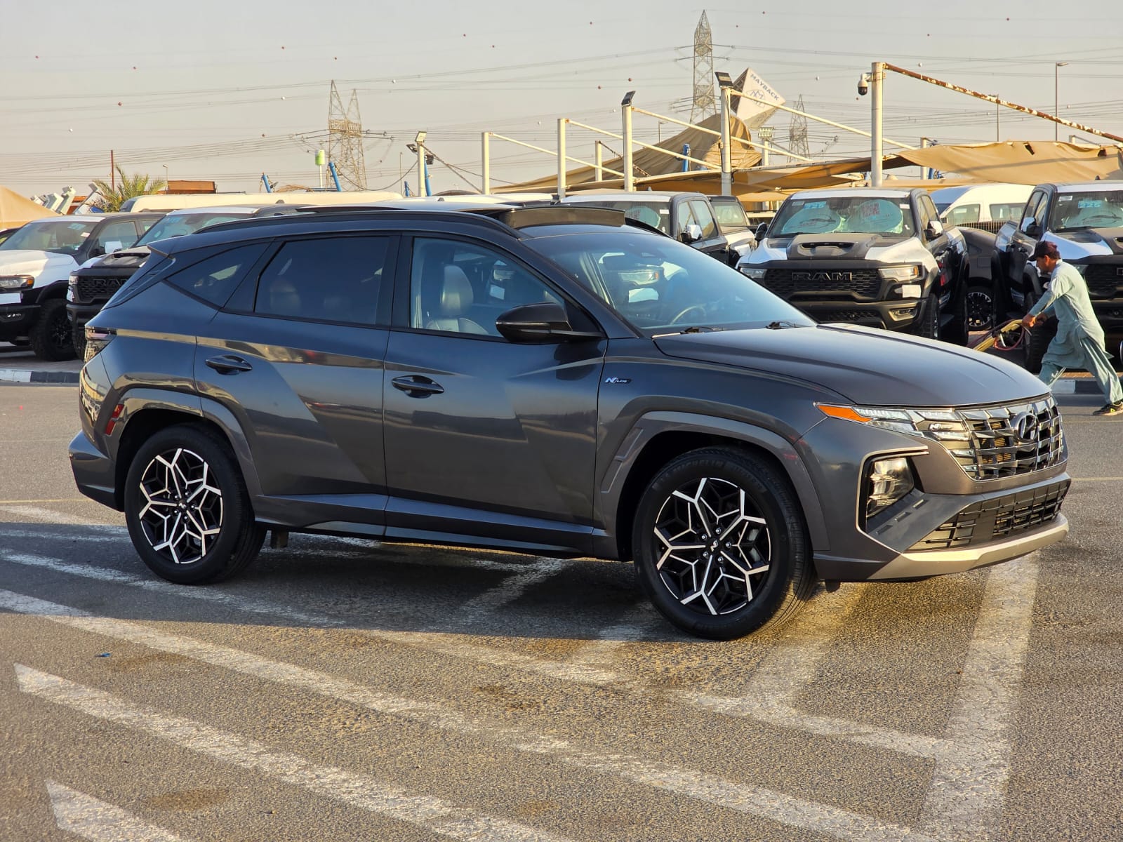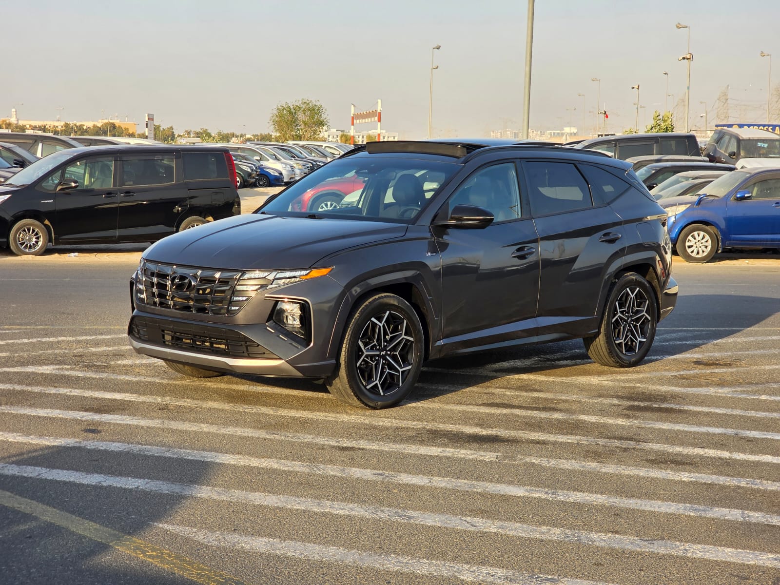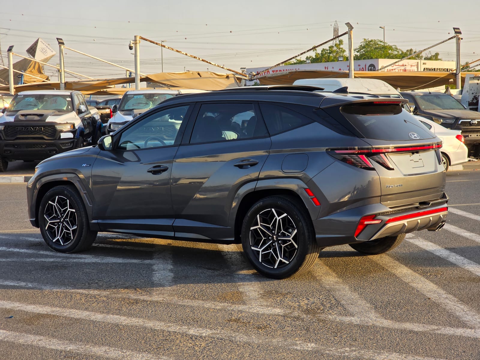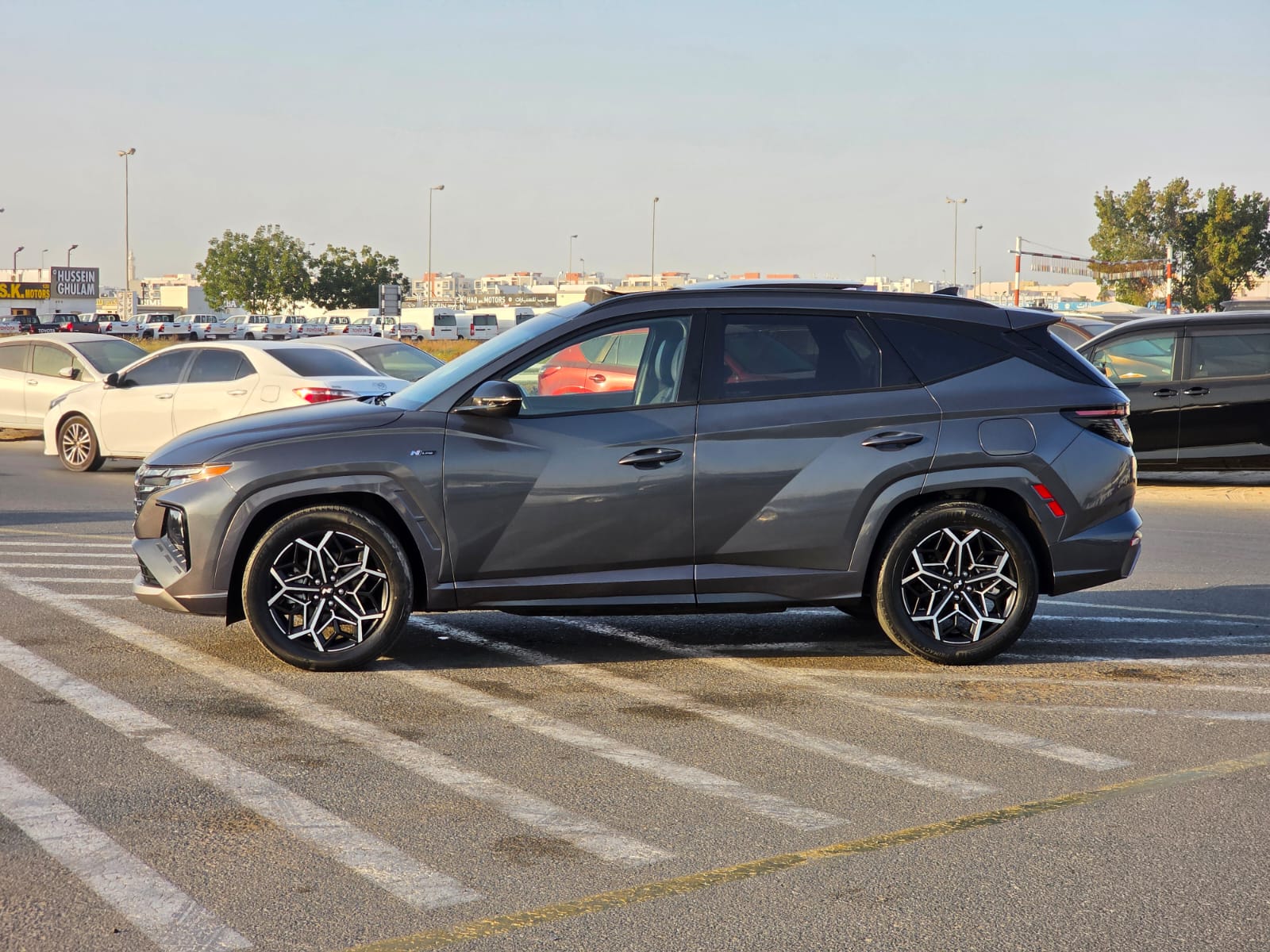 2023 Hyundai Tucson N Line Sport Edition with a 2.5L V4 engine, offering a sporty and modern driving experience. The vehicle comes with a panoramic roof, original leather seats, push button start, and automatic trunk, combining comfort with premium convenience.